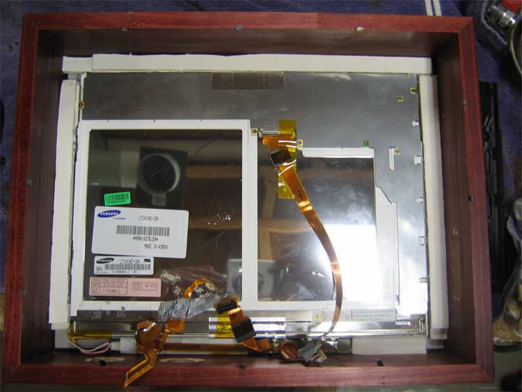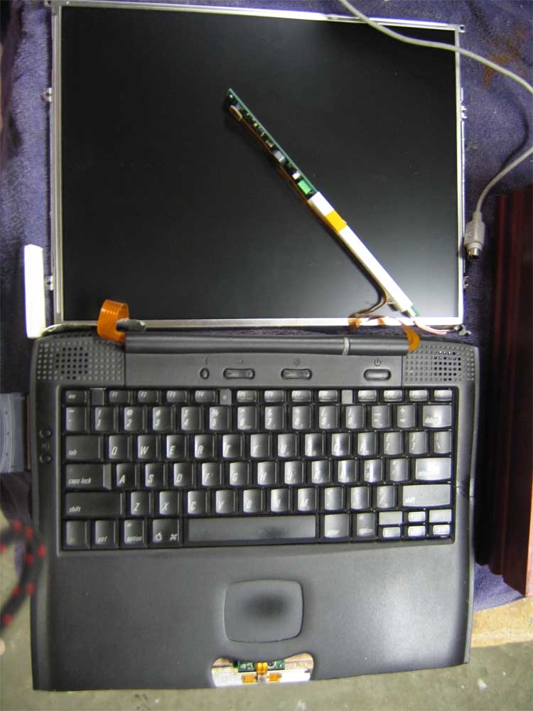 Below you can see the screen and inverter board removed from the top and the trimmed bottom case. I had to remove the plastic button but I kept the mounting screws and the actual mouse button. I put the unit back together as much as possible so I had tghe functionality of the keyboard and the control buttons. Notice the cord for the apple mouse. I use a mouse with the assembled picture box so I can see the screen. I had to remove the battery and CD-ROM.