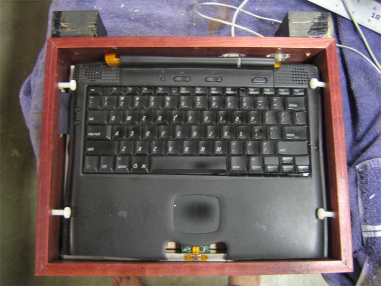Here is a picture with the PowerBook body installed. Note the nylon screws holding the machine in the box. Also, I had to drill holes for the power adapter and the mouse as well as the wireless card. I had make block feet to accommodate the cords coming out the bottom of the frame.