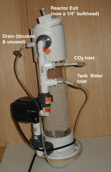 - The reactor exit is a 1/4" bulhead union threaded into the threaded cap. Using a bulkhead union in the cap as the exit allows for unreacted, excess CO2 to escape and avoids buildup of CO2 in the reactor which will eventually cause the pump to suck the CO2 and not circulate water. Plugging of the exit is avoided since there is no restriction (e.g. valve).