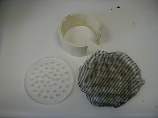 Below is the support plate I built to hold the aragonite media above the water inlet. Next time I will cut more of the screening to reduce channeling of the water through the media.