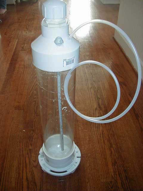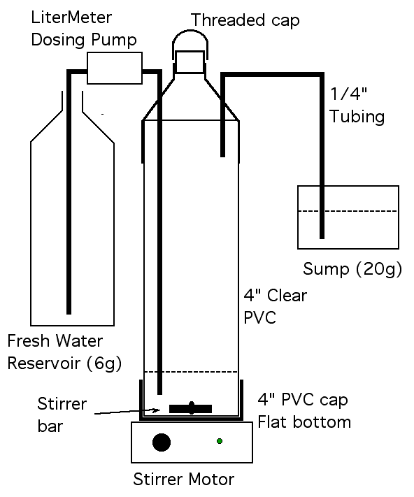 I used a flat 4" cap for the bottom so the reactor would sit on the stirrer motor. The round glass plate is placed on the bottom of the reactor before the top is sealed on. This glass plate eliminates wear on the plastic bottom cap from action of the stirrer bar combined with the calcium hydroxide (thanks, Kay!). I permanently cemented on the bottom cap using PVC cement but used silicone glue for the top (reducer) so I can take the top off if I ever need to. The threaded 1.5" cap makes it easy to add kalkwasser powder. I could have used a plug but thought it would be hard to open with me bent over. I have the fresh water enter at the bottom vial the toilet supply tube which mixes up a small amount of fresh kalkwasser every time the dosing pump activates.